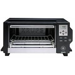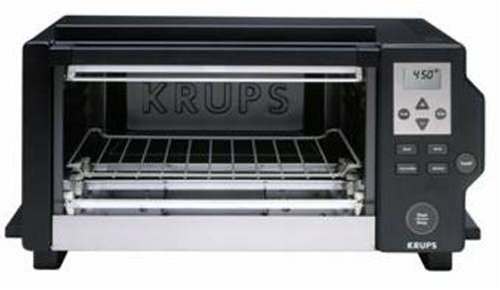 krups high-speed quartz heating system takes masterful control of heat in the chamber. Each set of quartz heating element, both top and bottom, is alternately powered at the full 1600 watts to maximize the effect of radiant heat. The heat distribution is aided by a special reflective crumb tray that directs this important form of heat to all corners for excellent results. Convection heat, important for longer baking times, circulates heated air around the food for the best result in the fastest time. The defrost function uses the convection fan only and gently and evenly defrosts food without producing hot spots. This 6-slice toaster oven has temperature controls in 25 degree increments from 150-450 degrees, a digital timer from 1 minute to 90 minutes and an auto shut off after elapsed time. For toasting, it has 9 levels or browning with a countdown timer. Illuminated LCD control panel with easy to use controls and high quality soft touch buttons, it has a digital clock that displays when the cooking functions are not in use. The non-stick interior surface is durable and easy to clean. This unit includes a non-stick bake pan, broiling tray and thermal resistant tongs for safe removal of hot pans or food and comes with a 1-year warranty.